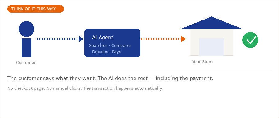 Imagine a customer tells their AI assistant: "Order me the best running shoes under €80 in size 43." The AI searches across dozens of stores, compares prices, checks reviews, picks the best match — and completes the purchase. No browser tabs, no checkout page, no clicking "Pay Now." The transaction just happens, entirely on the customer's behalf.