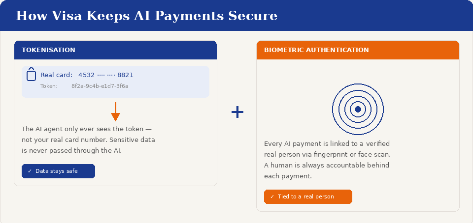 Tokenisation replaces a customer's real card number with a unique, secure digital code. When an AI agent initiates a purchase, it uses that token — never the actual account details. Sensitive financial data is never exposed in the process. Biometric authentication then ties every AI-initiated transaction back to a verified, real person — through fingerprint or face scan — ensuring there's always a human being accountable behind each payment.