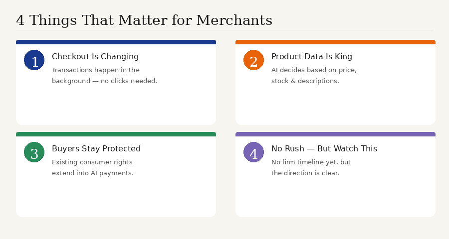 Here's the honest answer: nothing changes for you this week, or probably this year. Visa hasn't announced a firm timeline for when agentic payments will be available to consumers at scale — this is still a testing and preparation phase. But the direction is clear, and the pace across the industry is accelerating. Understanding what's coming now is the difference between being ready and scrambling to catch up.