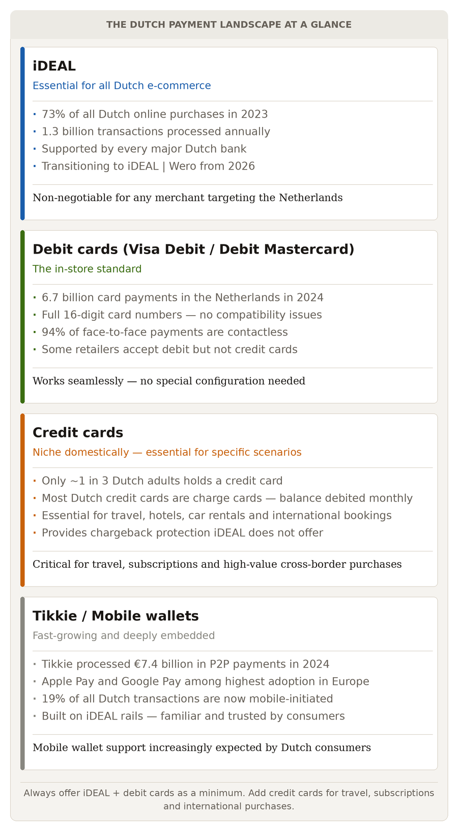 For merchants, the lesson is straightforward: the Dutch payment mix is not complicated, but it is specific. iDEAL dominates online. Debit cards dominate in-store. Credit cards fill the gap for travel, international use, and consumer protection scenarios. Miss any one of these, and you miss a meaningful portion of what Dutch consumers need.