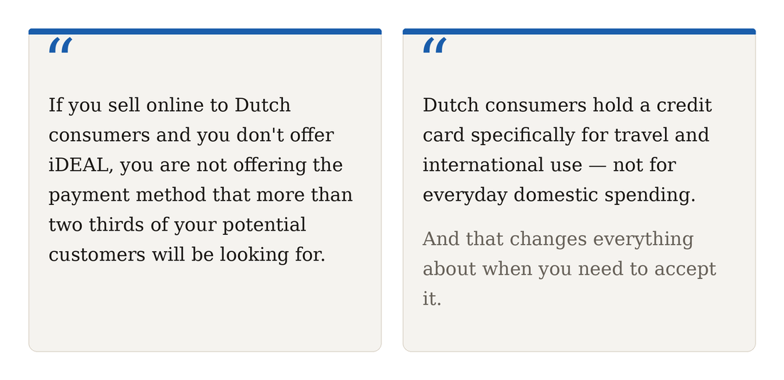 But what they adopted — and how — is quite specific. The dominant instruments are debit cards and iDEAL, not credit cards. And that distinction matters enormously for how you structure your checkout.