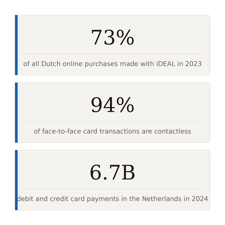 By 2023, iDEAL accounted for 73% of all Dutch online purchases, processing over 1.3 billion transactions annually. Every major Dutch bank supports it. Every significant Dutch e-commerce platform offers it. If you sell online to Dutch consumers and you don't offer iDEAL, you are not offering the payment method that more than two thirds of your potential customers will be looking for.