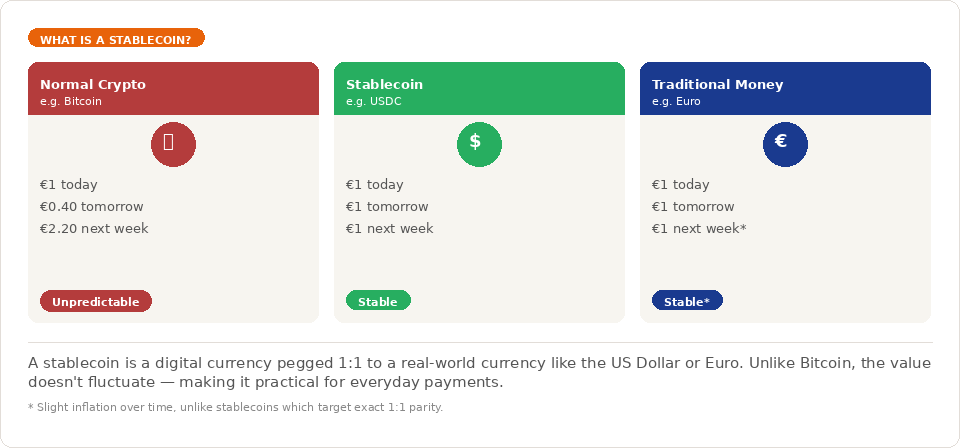If you've never had to think about this before, that's fine. Here's the short version: a stablecoin is a digital currency that is pegged 1:1 to a real-world currency — usually the US Dollar. Unlike Bitcoin or Ethereum, the value doesn't go up and down wildly. One USDC (a popular dollar-backed stablecoin) is always worth one US Dollar. That's the whole point.