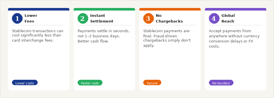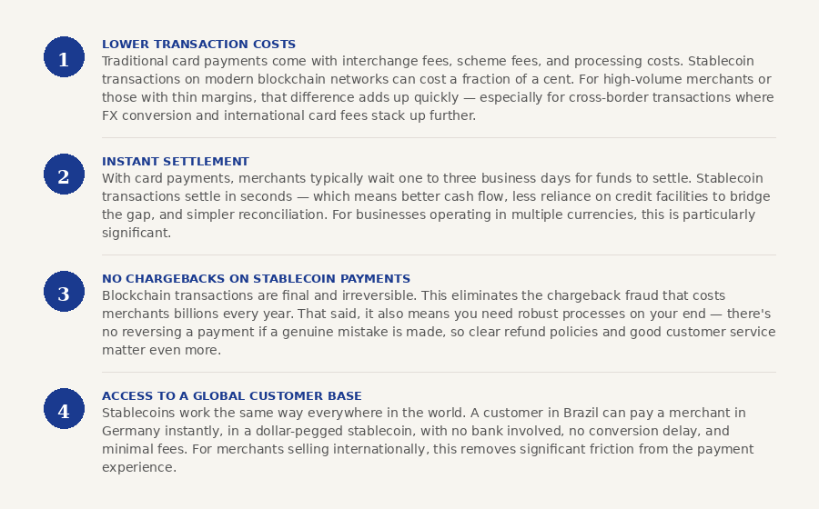 You don't need to accept stablecoins tomorrow. But understanding the genuine advantages — and the genuine complications — puts you in a much better position as this develops.