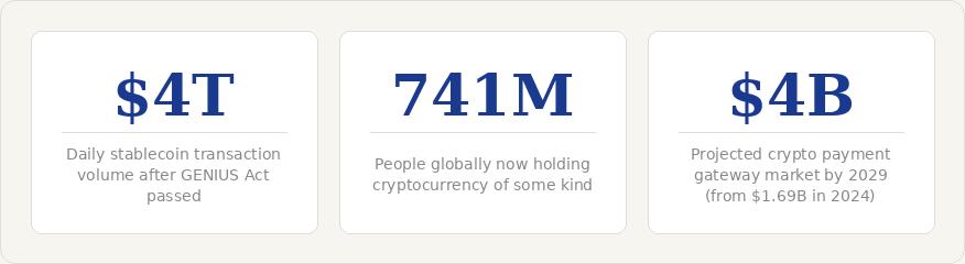 Stablecoins have crossed a threshold. They are no longer a niche crypto product — they are becoming regulated financial infrastructure, backed by the world's largest banks and technology companies, governed by federal law, and processing trillions of dollars in transactions. The question for merchants is not whether stablecoins will become a payment option their customers expect — it's how quickly that happens, and whether they're ready when it does.